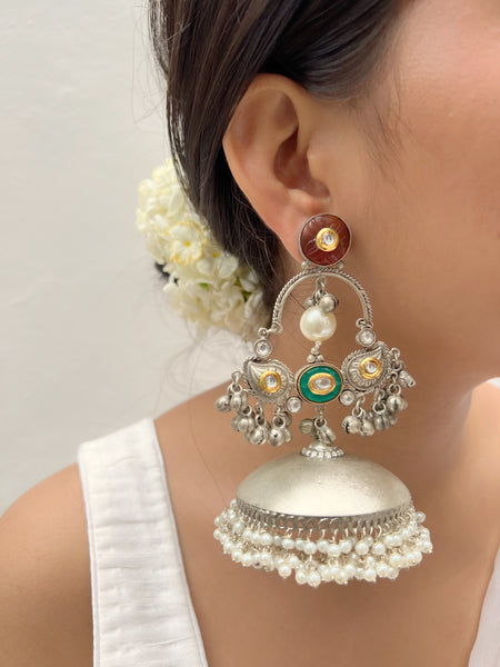 Our "Aanya" is a classic fusion of exquisite craftsmanship and feminine elegance, this set will be a treasured inclusion in every woman's jewellery collection. Embodying grace and refinement, these silver pearl & ghunghroo earrings are a testament to timeless beauty. The lustrous pearls gracefully cascade...