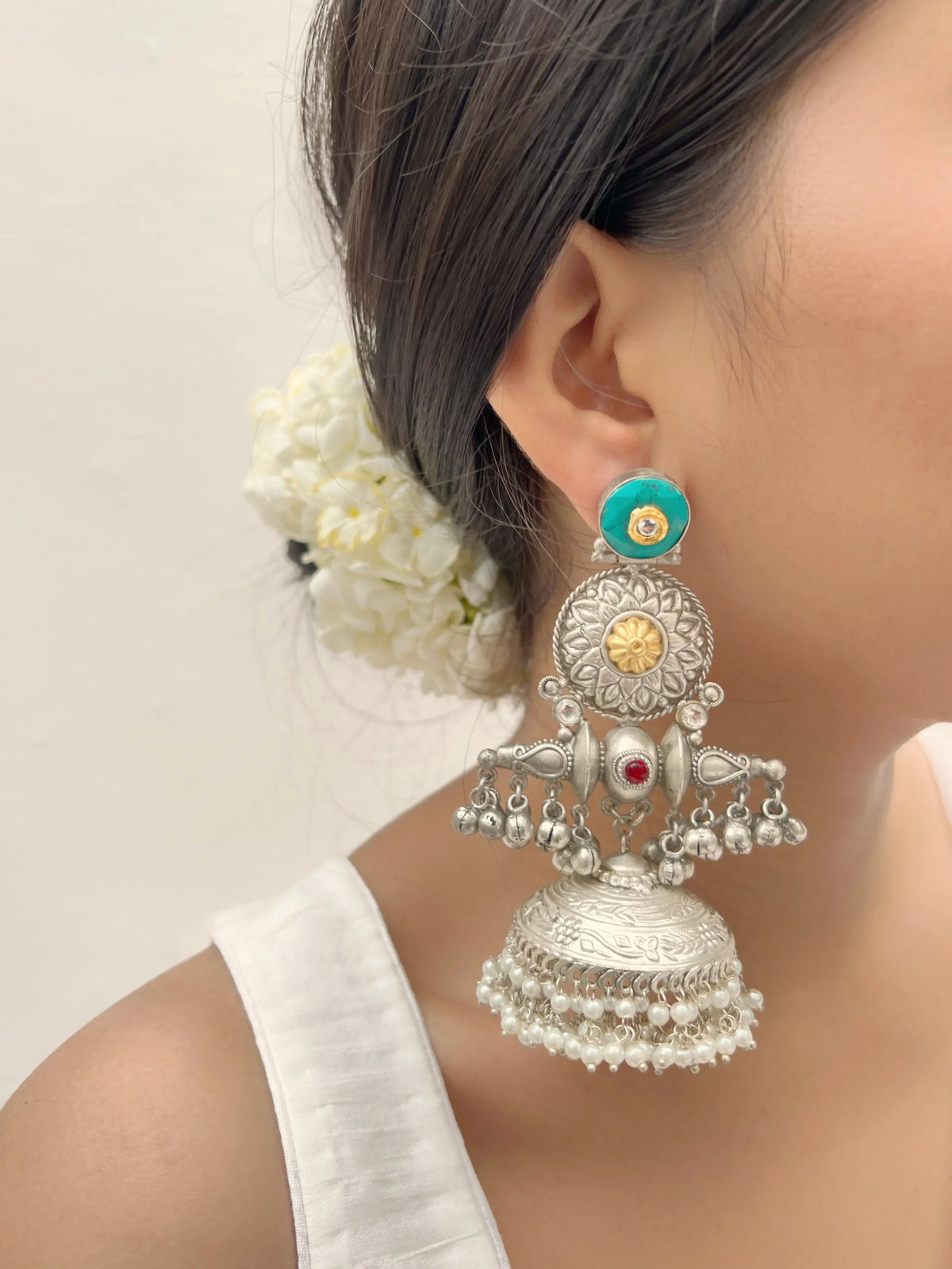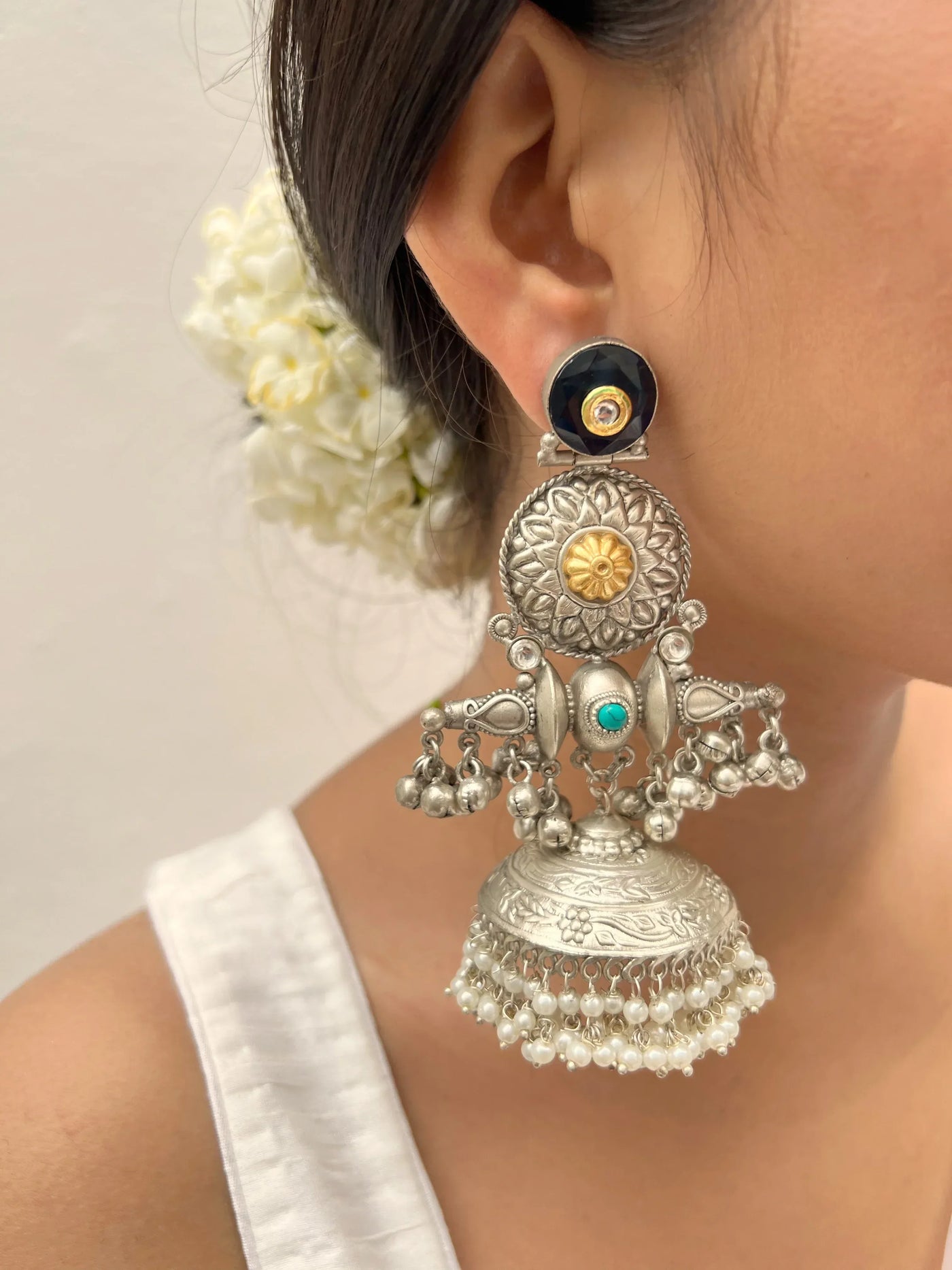 Embodying grace and refinement, these silver pearl & ghunghroo earrings are a testament to timeless beauty. The lustrous pearls gracefully cascade from the silver frame, accompanied by the gentle jingle of ghunghroos. Enhanced by the fusion of purity and charm, these earrings effortlessly elevate any traditional Navratri outfit.