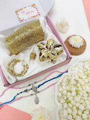 This Raksha Bandhan, wrap your love in a box that sparkles as much as she does. This radiant hamper features a stunning statement handcuff (₹1249) and trendy ring hoops (₹799) — both in a matching finish for a coordinated, luxe look. To keep things fun and festive, the claw clip (₹99), cocktail ring (₹199), and designer Rakhi (₹149) come in assorted colors, adding a unique touch to every box.