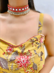 Introducing our exquisite Falguni choker that radiates elegance and sophistication! The beauty of the necklace lies in its ability to elevate any outfit, making it a true statement piece. Whether it's a special dandiya performance demanding a touch of sophistication or a desire to elevate your traditional attire, this set will effortlessly exude your unique style and charm.