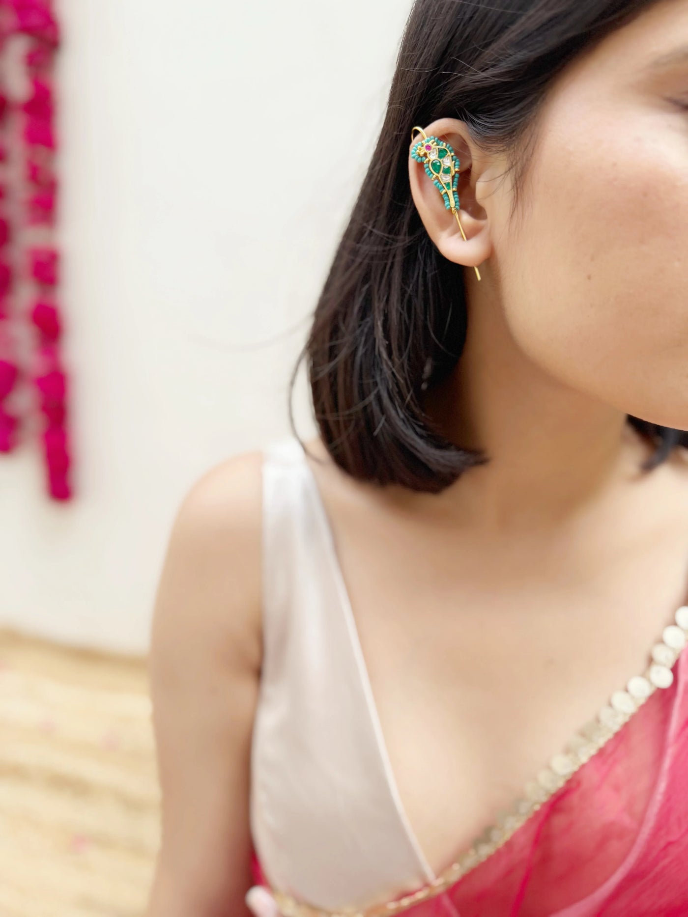 “Our needle earrings and bugadi designs boast intricate details and subtle sparkle, making a statement with every wear. Crafted from high-quality brass and Paanchi Kundan, these earrings are as durable as they are beautiful. Whether dressing up or dressing down, our minimal desi jewelry pieces shine bright, elevating your everyday style."