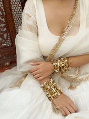 Plain golden bangles used in stack our just for styling, doesn’t come in the set. Vintage-inspired ghunghroo bangles with pearl...